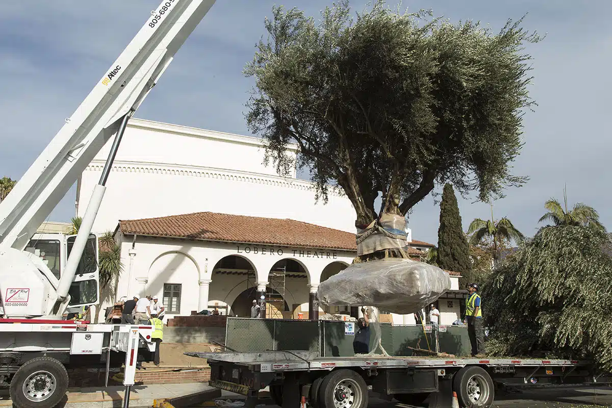 Lobero Theatre Foundation plants mature, fungus-resistant Olive Trees to replace those lost during construction.