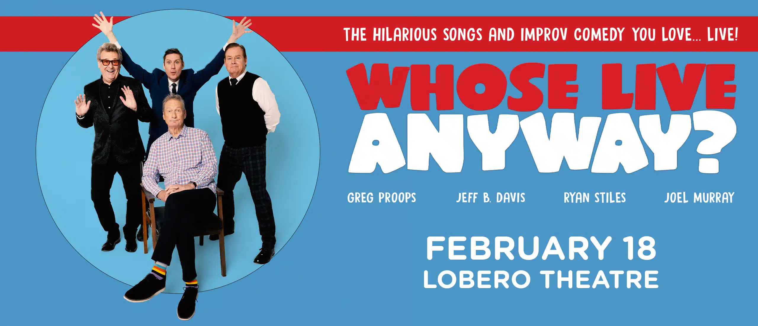 WHOSE LIVE ANYWAY? is 90 minutes of hilarious improvised comedy and song all based on audience suggestions. Cast members Greg Proops, Jeff B. Davis, Ryan Stiles, and Joel Murray will leave you gasping with the very witty scenes they invent before your eyes. Audience participation is key to the show, so bring your suggestions and you might be asked to join the cast onstage!